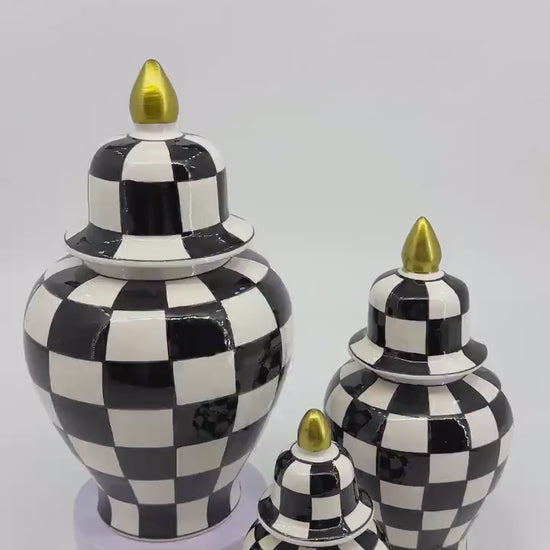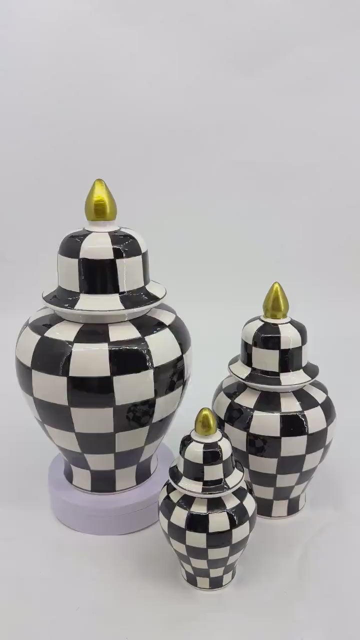 Discover the elegance of the Checkered Ceramic Vase Set with Gold Lid, designed to elevate any modern home decor with its bold black and white checkered pattern and luxurious glossy gold lid. This eye-catching ceramic vase set is perfect for those looking to add a sophisticated and contemporary touch to their living spaces.