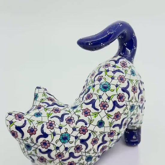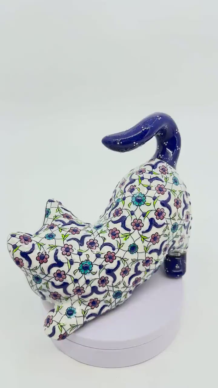 Hand-Painted Ceramic Cat Figurine: Turkish Blue Floral Decor