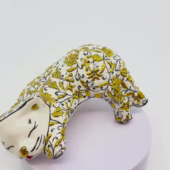 Hand-Painted Ceramic Sleeping Cat Figurine: Gold Floral Turkish Decor