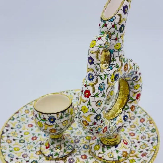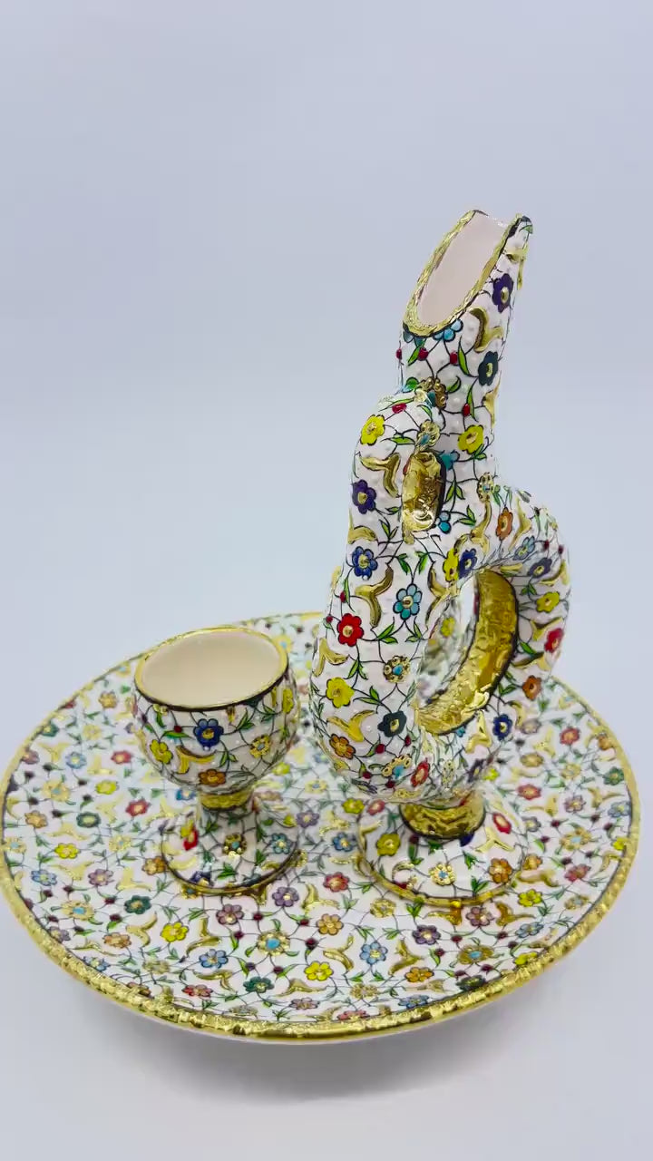 Bring the charm of Turkish culture into your home with this stunning hand-painted ceramic set. Inspired by the ancient Hitit civilization and adorned with Ottoman-style floral motifs and gold details, this set includes a uniquely shaped pitcher, a matching tray, and two goblets — perfect for serving or decorative display.