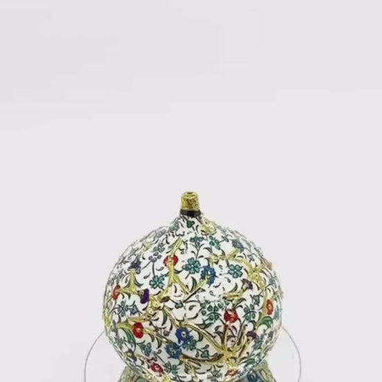 🌟 Design: A stunning ceramic fig ornament adorned with intricate Iznik-style floral patterns and gold accents, perfect for any decor.