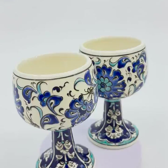 Handmade Ceramic Goblet Set: Turkish Floral Design, Blue and White Chalices