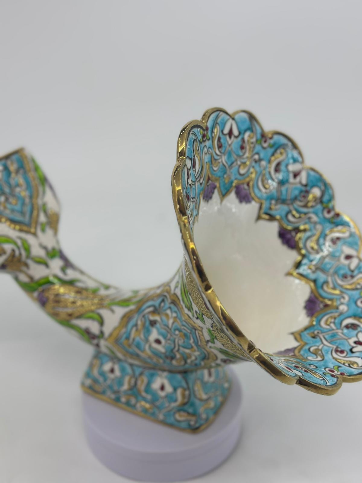 Handmade Ceramic Gramophone Amplifier: 25K Gold Turkish Pottery Horn Speaker is an exquisite blend of art and functionality. This beautifully crafted ceramic gramophone amplifier features authentic 25K gold accents and a distinctive horn shape that naturally amplifies your phone's sound without any power needed. Inspired by traditional Turkish craftsmanship and Iznik floral motifs, this piece brings a vibrant splash of color and timeless elegance to any room.