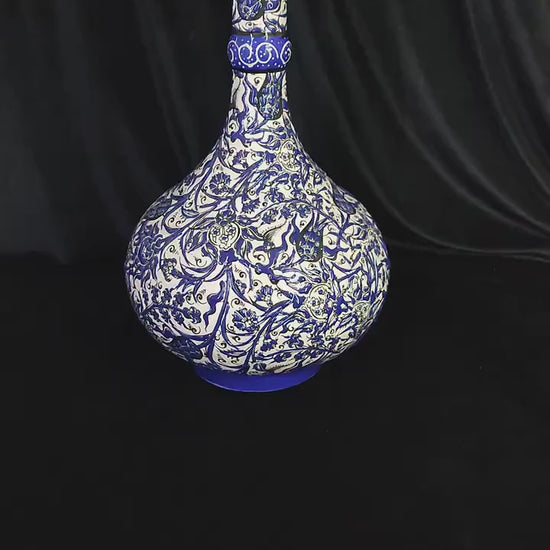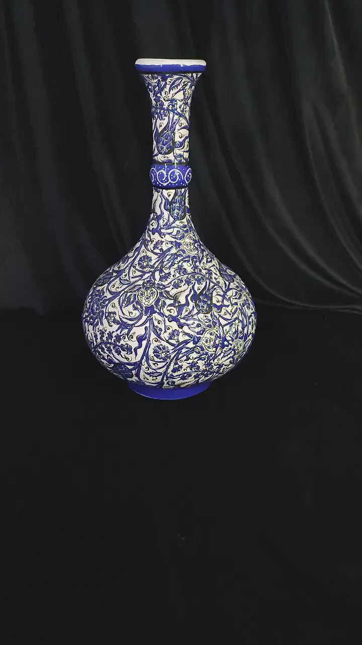 Handmade Turkish Ceramic Vase: 12" Blue Floral Anatolian Pottery